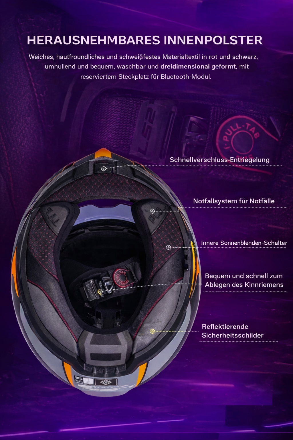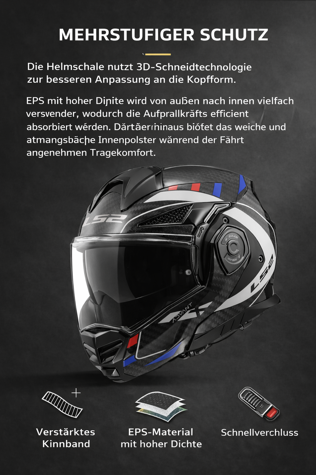 Das Helmfutter lässt sich leicht herausnehmen und abwischen. Die Wangenpolsterung ist per 3D-Lasertechnologie präzise zugeschnitten und garantiert so eine perfekte Passform. Das antimikrobielle Material reduziert unangenehme Gerüche und ist hypoallergen für optimalen Tragekomfort. Eigenschaften des LS2 FF906 Advant-X Carbonfaser-Futters: