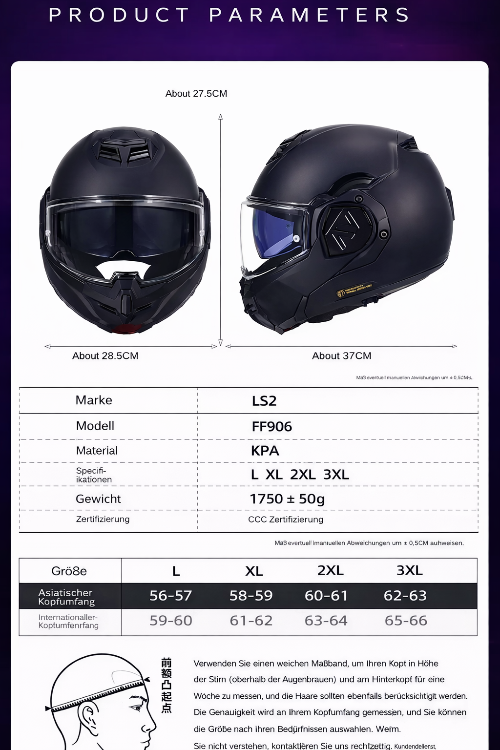 Das Gewicht der LS2 FF906 Premium-Version Kappe beträgt 1600±50g (einschließlich Zubehör).