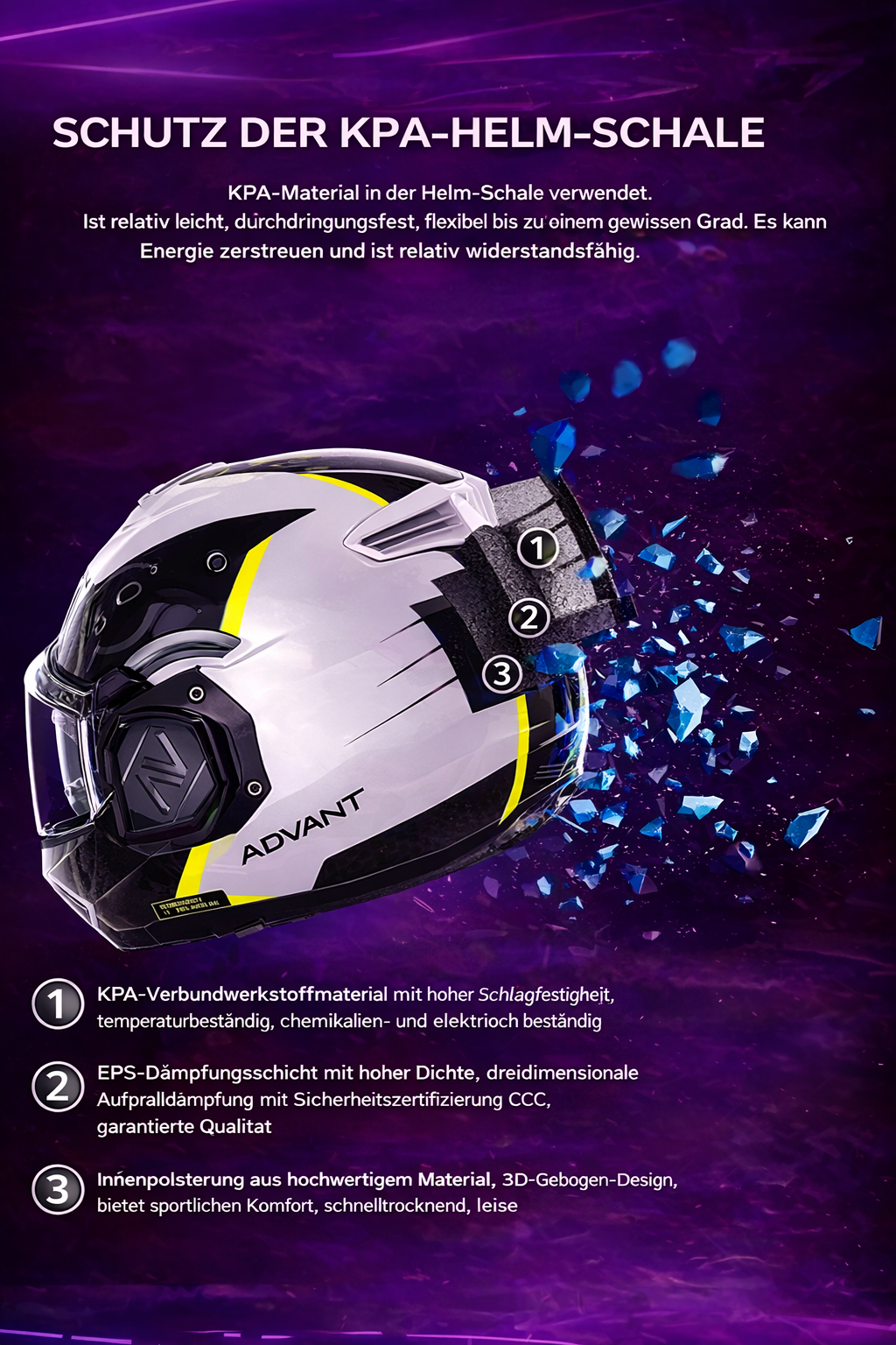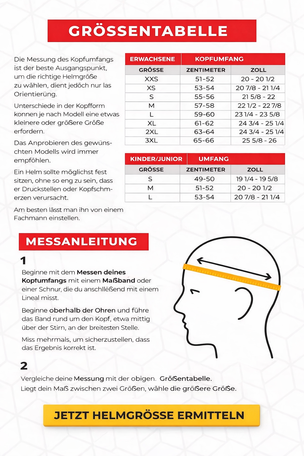 Für optimale Sicherheit muss der Benutzer die richtige Helmgröße wählen und die Riemen festziehen. Achten Sie außerdem auf die Form des Helms und des Außenschalenmaterials, insbesondere bei einem Aufprall. Am wichtigsten ist die perfekte Passform: Von der Schalenform bis zur Form des EPS-Schaums muss alles optimal auf den Kopfumfang abgestimmt sein.
